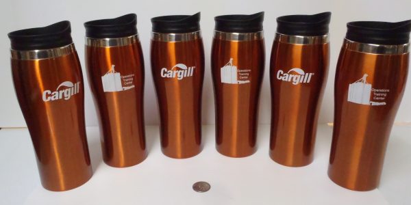 Cargill’s Operational Training Center has these unique tumblers that are constructed with a stainless-steel outer shell and liner. They are sweat-proof and hold 15 oz when filled to the rim. Their logos stand out on the orange. See us to learn what we can do for you.